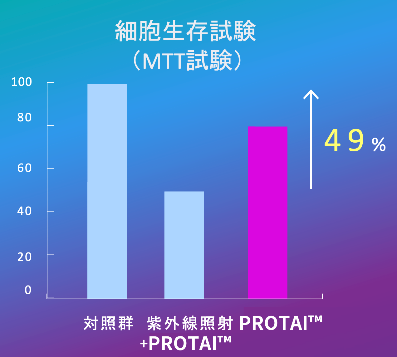 24孔培養皿に5X10⁵個の細胞を播種し、PROTAI™の特異的配列ペプチドを添加しました。培養を24時間行った後、UVライトボックスを使用して100ミリジュール(mJ)の照射を行い、その後培養皿を培養箱に静置して30分間放置しました。その後、上清液を取り出してMTT細胞生存率試験を行いました。