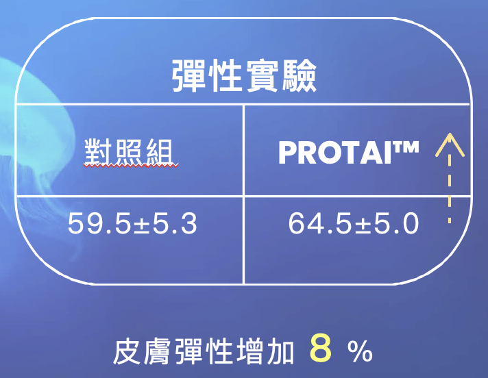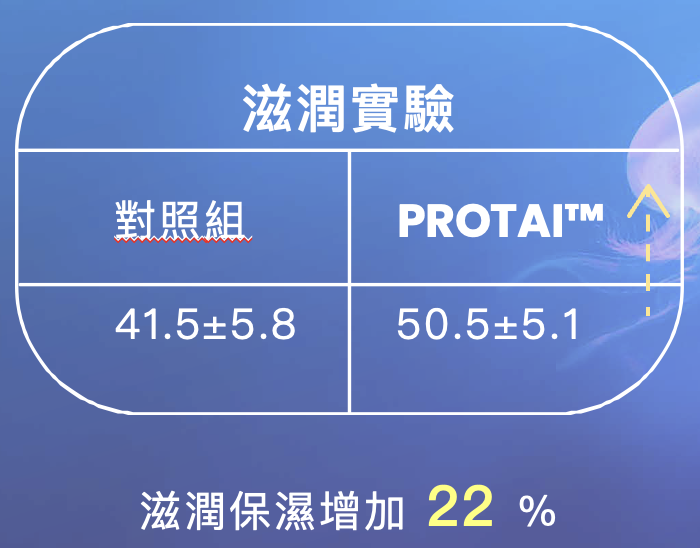使用PROTAI™的特定序列胜肽後測試,滋潤保濕增加22%,皮膚彈性增加8%,具有保濕與恢復彈性效果。